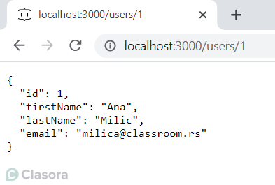 Posetom linka http://localhost:3000/users/1 u pretraživaču će biti prikazani podaci za korisnika sa id=1.