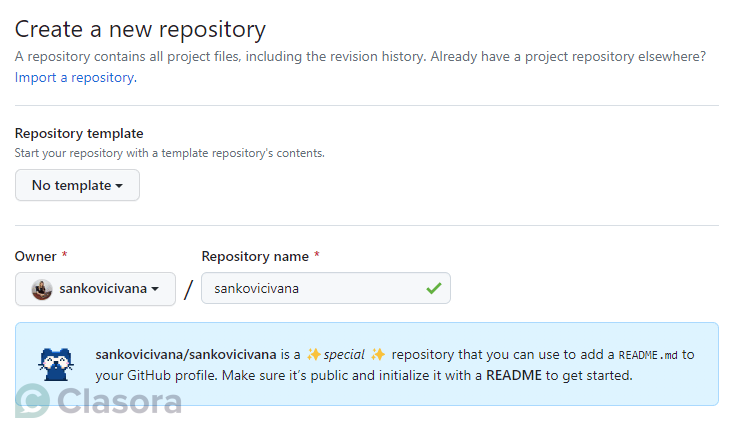 Na primer moj username na Githubu je sankovicivana, i kao ime repozitorija sam upisala svoj username. Vi ćete uraditi isto sa vašim nalogom.