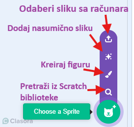 Scratch dolazi sa bogatom bibliotekom gotovih figura – od životinja i ljudi, do vozila i fantastičnih likova. Klikom na ikonicu „Choose a Sprite from Library“, otvoriće se katalog iz kojeg možete izabrati figuru po želji.