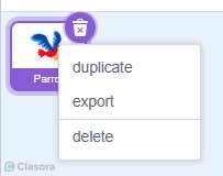 Duplicate (dupliraj) – scratch će odmah napraviti identičnu kopiju te figure, zajedno sa svim kostimima i kodom. Ova funkcija je korisna kada pravite više sličnih likova ili kada želite da radite izmene bez gubitka originala.