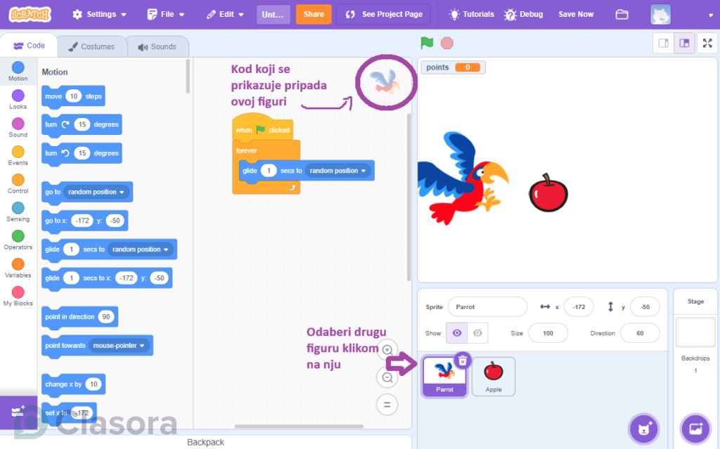 Svaki Scratch program sadrži listu figura, a svaka figura može imati svoj kod. Važno je da budemo pažljivi prilikom dodavanja novog koda, kako bismo znali za koju figuru ga dodajemo i kako se prelazi između figura.
